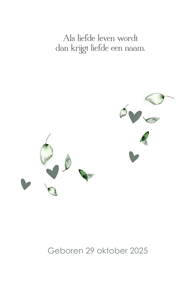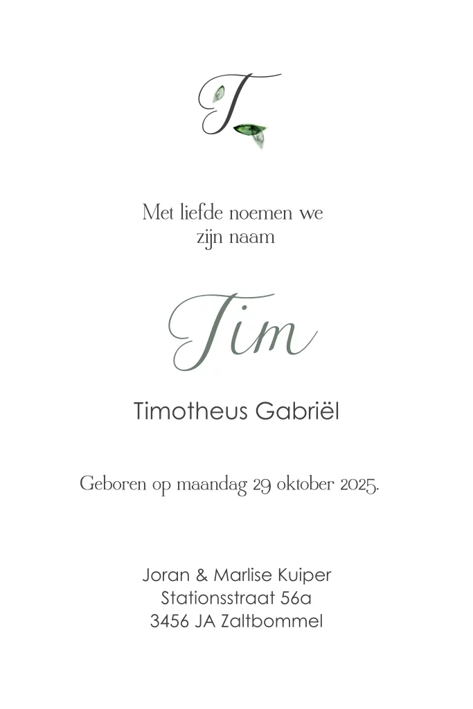 Op dit stoere geboortekaartje wordt op de voorkant de naam en op achterkant het initiaal met zwartfolie gedrukt. Je kunt ook een andere kleur folie kiezen. Mooi met een groene envelop.