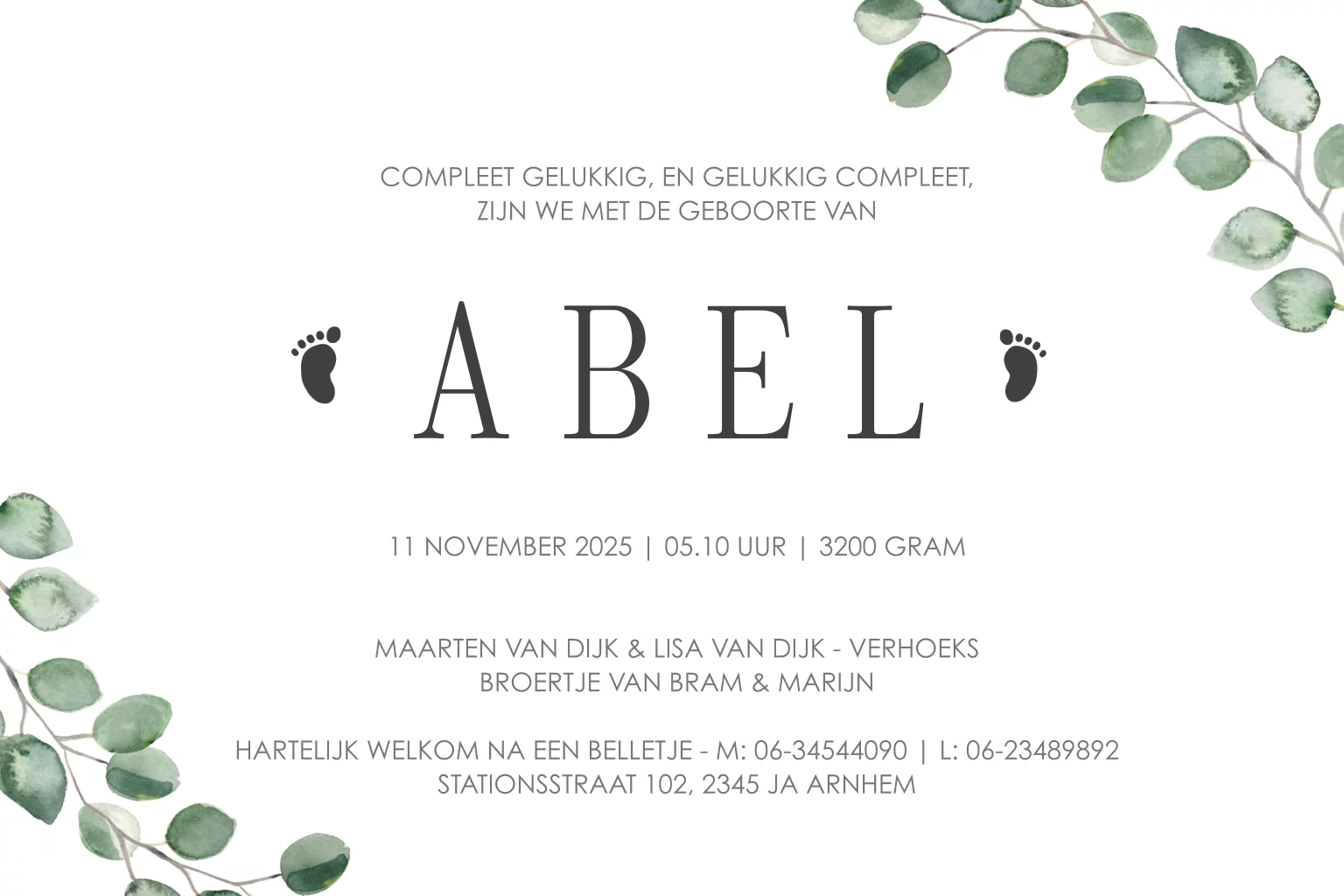 Geboortekaartje jongen met blaadjes en zwartfolie
