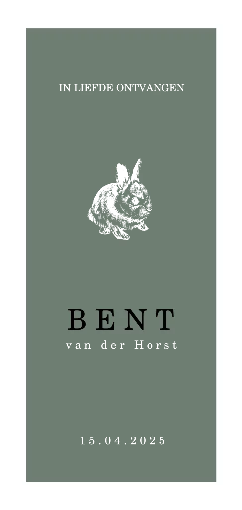 Op de voorkant van dit stoere jongens geboortekaartje worden alle teksten en het konijntje met zwartfolie gedrukt.