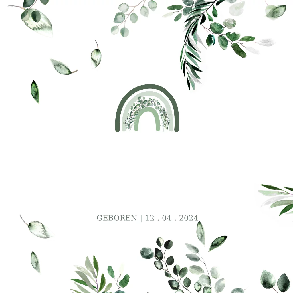 Een botanisch geboortekaartje met regenboogje. Alleen op de voorkant wordt de naam met roséfolie gedrukt.