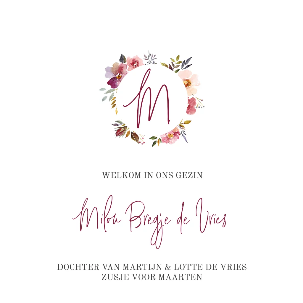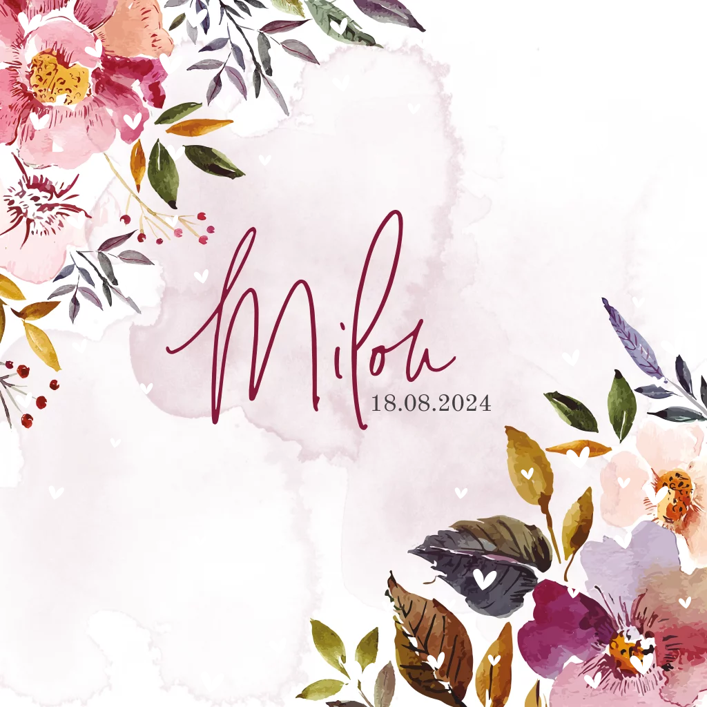 Geboortekaartje voor meisjes met bloemen en roséfolie