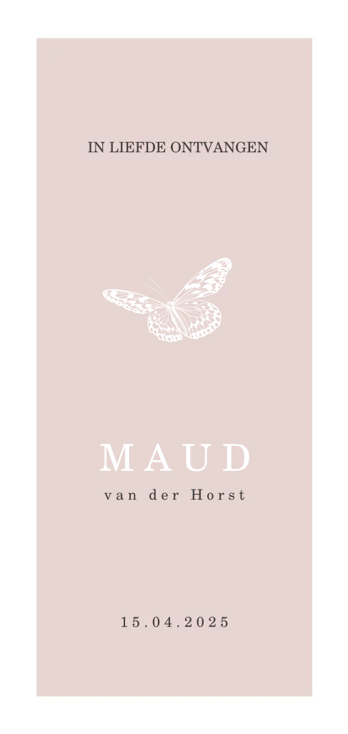 Een vlinder geboortekaartje met zilverfolie op de voorkant. Dit meisjes geboortekaartje wordt gedrukt op het formaat 10 bij 21 cm.