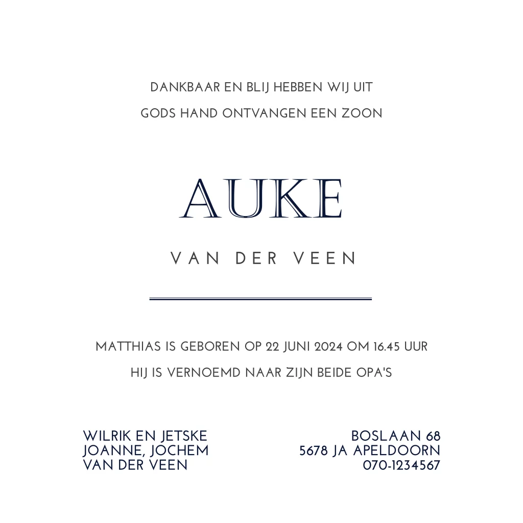 Op dit klassieke geboortekaartje wordt op de voorkant en achterkant goudfolie gedrukt. Mooi bij dit geboortekaartje is de donkerblauwe envelop met gouden inlay.