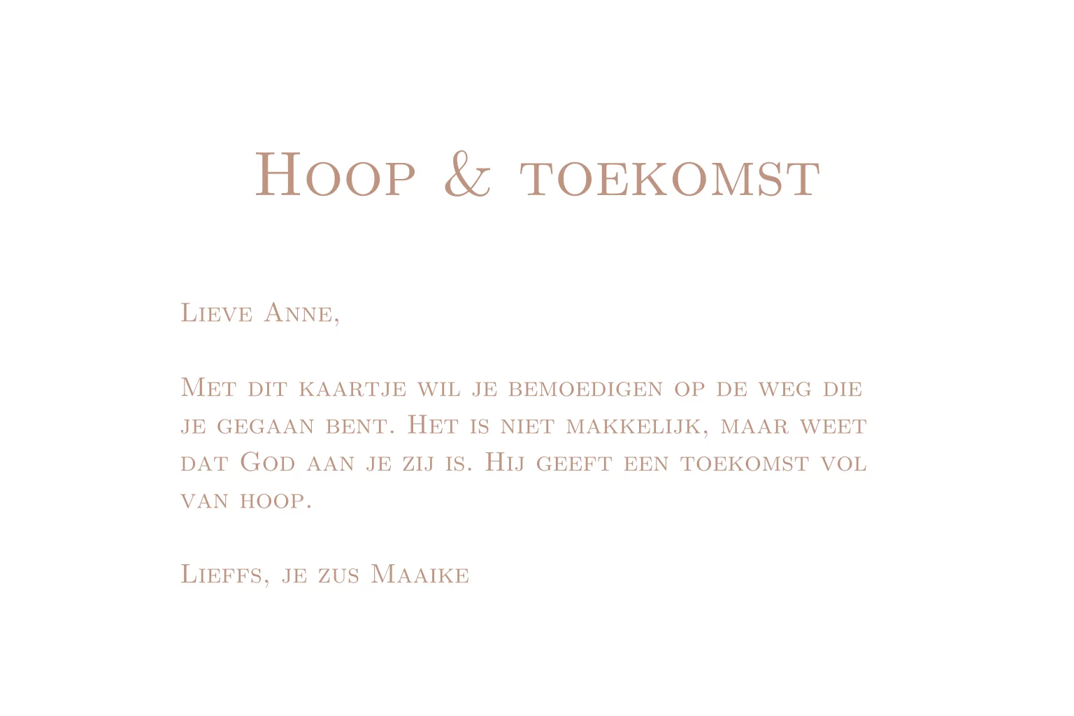 Stuur een christelijk kaartje met de tekst uit een lied van Sela: U geeft een toekomst vol van hoop; Dat heeft U aan ons beloofd. Niemand anders, U alleen,