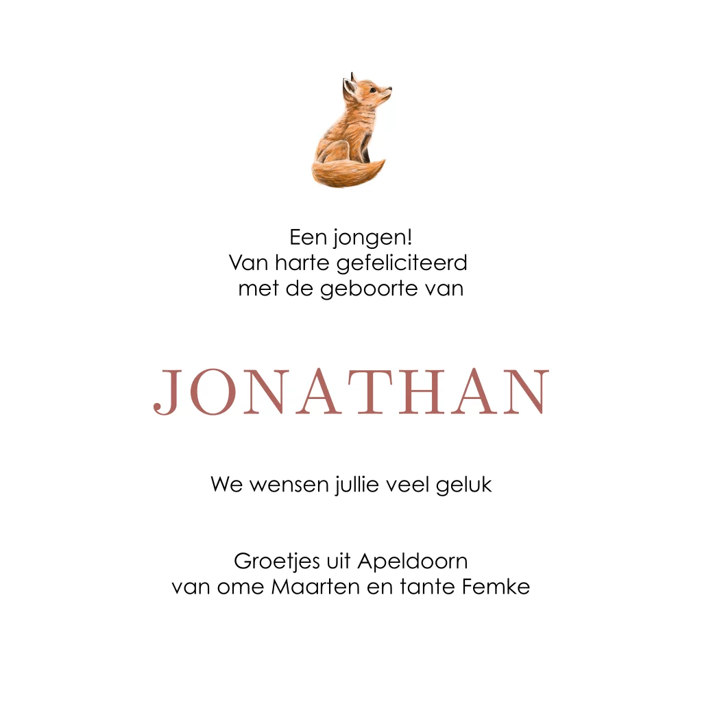 Een kaartje met een vosje om te versturen voor de geboorte van een jongen. Deze kaart kan ook gebruikt worden voor een meisje door de teksten aan te passen.