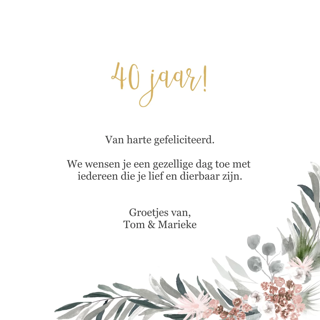 Stuur voor de verjaardag van een vrouw een luxe kaart met goudfolie , bladeren en bloemen. Je kunt aan de binnenzijde liefdevolle woorden toevoegen.