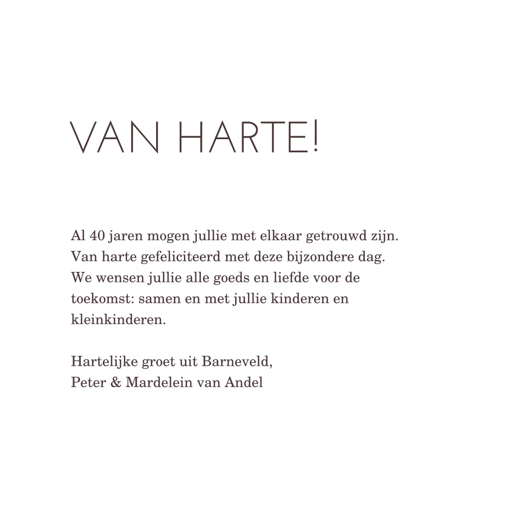 Maak zelf een stijlvolle felicitatiekaart voor iemand die een jubileum viert. Op deze kaart hebben we gekozen voor 40 jaar getrouwd, maar dit kan natuurlijk voor elk jubileumjaar aangepast worden.