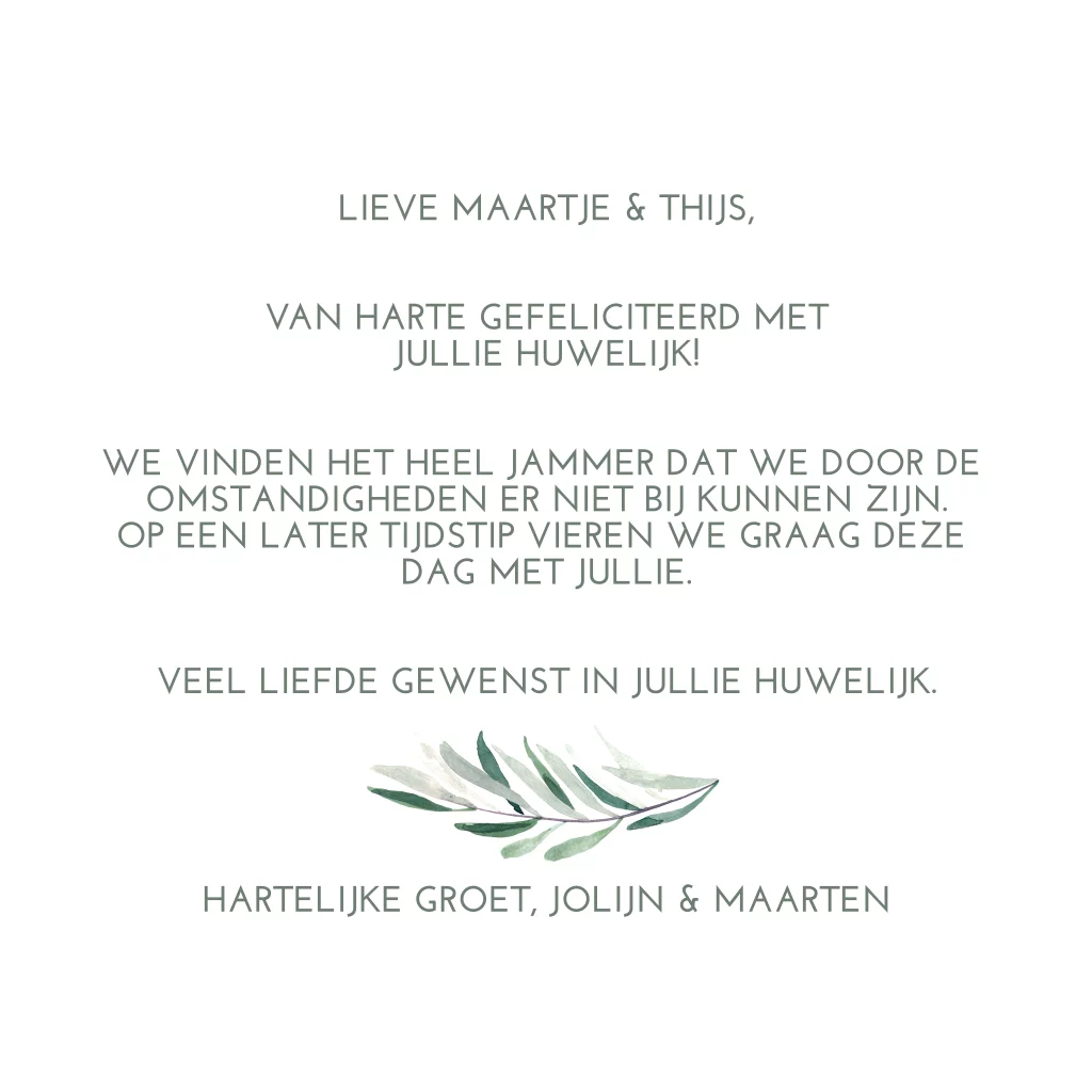 Een felicitatiekaart voor trouwdag met een eucalyptustakje en letters in groen. Je kunt deze kaart direct verzenden naar hun adres. Maak in de kaartopmaker een mooi ontwerp en bestel de felicitatiekaart.