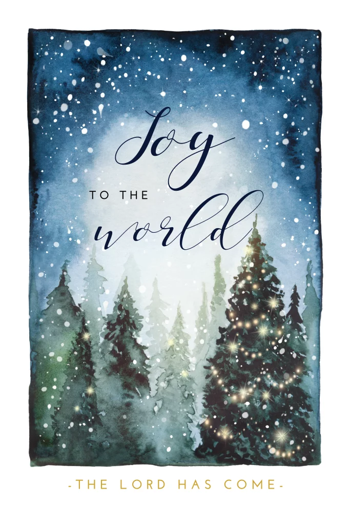 Christelijke kerstkaart met de tekst: Joy to the world - the Lord has come. Teksten op deze kerstkaart kunnen aangepast worden zodat je altijd een unieke kerstkaart bestelt.