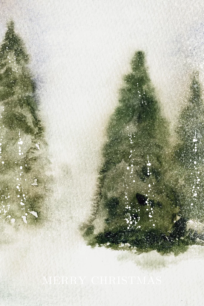 Maak een kerstkaart met sfeervolle dennenbomen. Op de beide zijden wordt goudfolie gedrukt. Op de voorkant zijn mooie goudspetters over de bomen verspreid voor een chic effect.