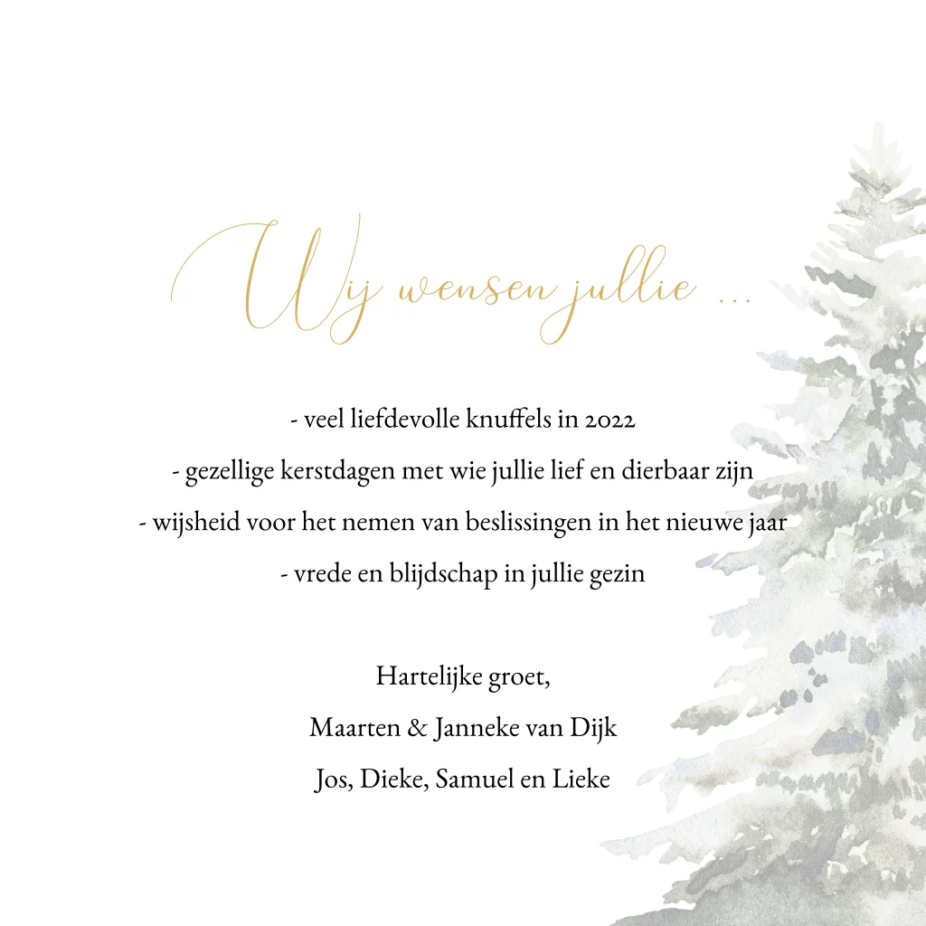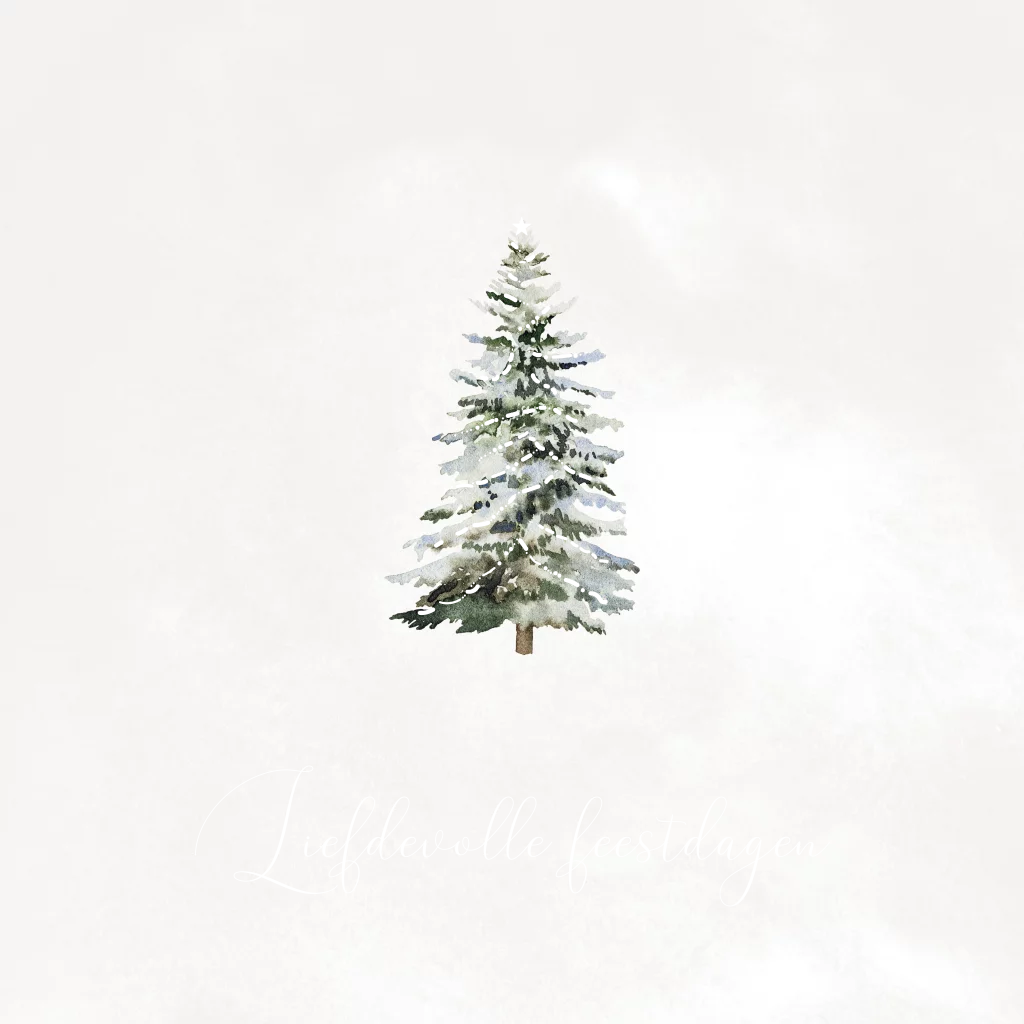 Bestel luxe kerstkaarten met dit dennenboompje en goudfolie. Op de voorkant wordt Liefdevolle Feestdagen en de lichtjes in het dennenboompje met goudfolie gedrukt. Dit geeft een luxe uitstraling. Aan de binnenzijde kun je de tekst aanpassen.