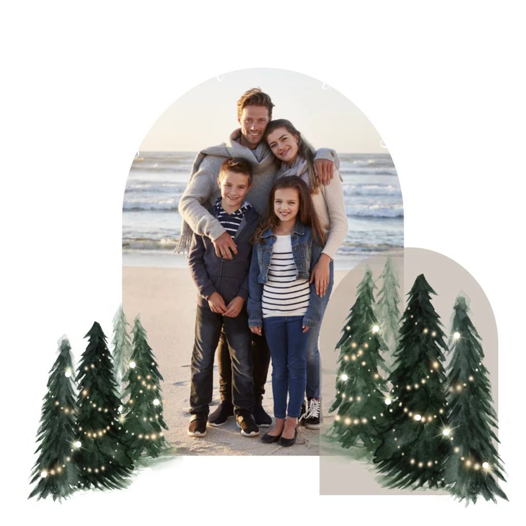 Luxe kerstkaart met foto, kerstboompjes en goudfolie