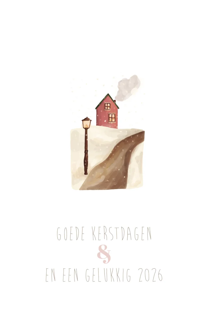 Stijlvolle kerstkaart met een sereen sneeuwlandschap en een knus huisje dat zacht oplicht in de winterse stilte.