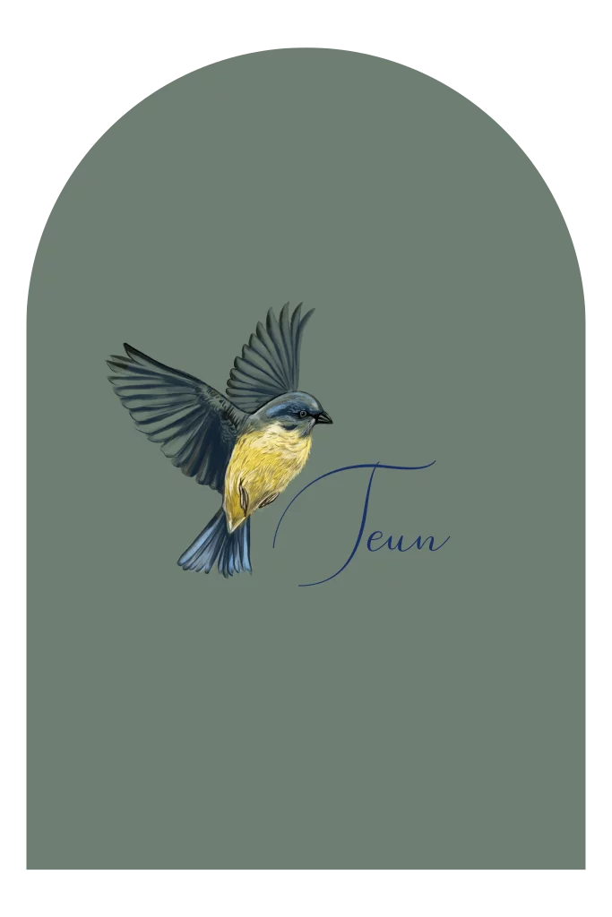 Geboortekaartje met een mooie vogel in een boogvorm. De kaart is helemaal naar wens aan te passen zodat het bij jullie past.