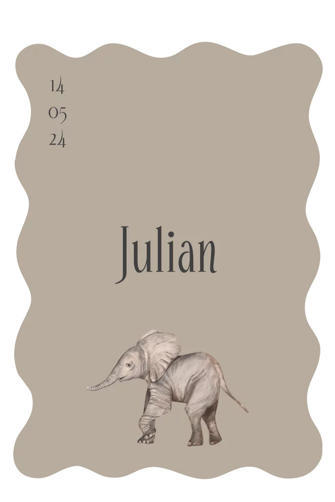 Geboortekaartje voor een jongen in een golvende vorm met een olifant op de voorkant. De kaart is naar wens aan te passen zodat deze perfect bij jullie past!