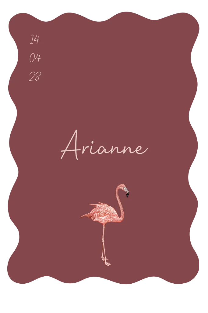 Geboortekaartje voor een meisje in een golvende vorm met een flamingo op de voorkant. De kaart is naar wens aan te passen zodat deze perfect bij jullie past!