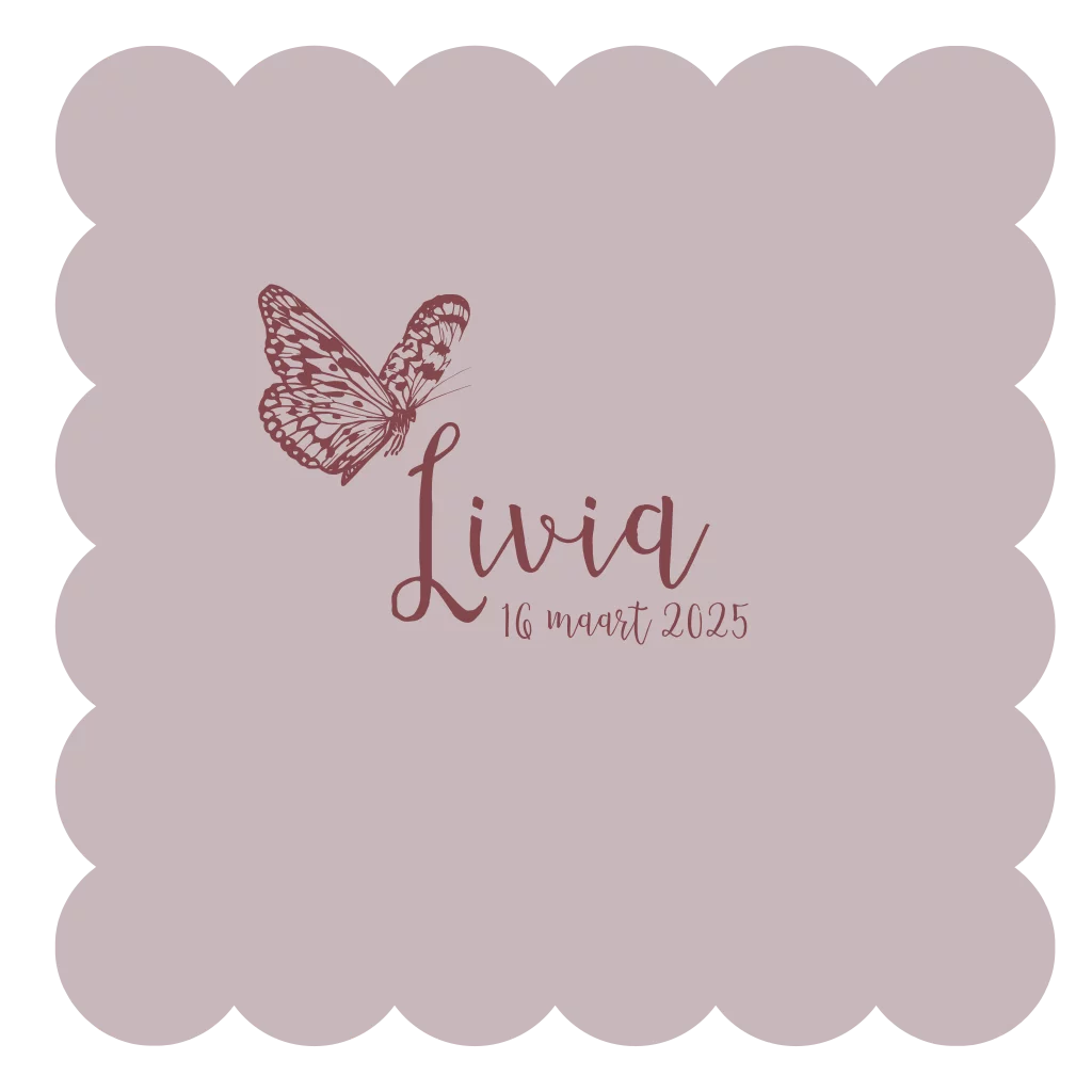 Geboortekaartje voor een meisje in een golvende vorm met een vlinder op de voorkant. De kaart is naar wens aan te passen zodat deze perfect bij jullie past!